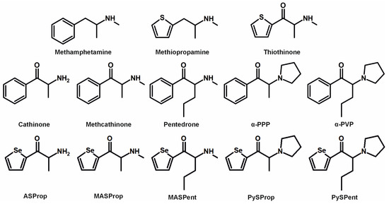 Chemical structures of methamphetamine, methiopropamine, thiothinone, cathinone, methcathinone, pentedrone, α-PPP, α-PVP, and the five selenium-containing cathinone derivatives.