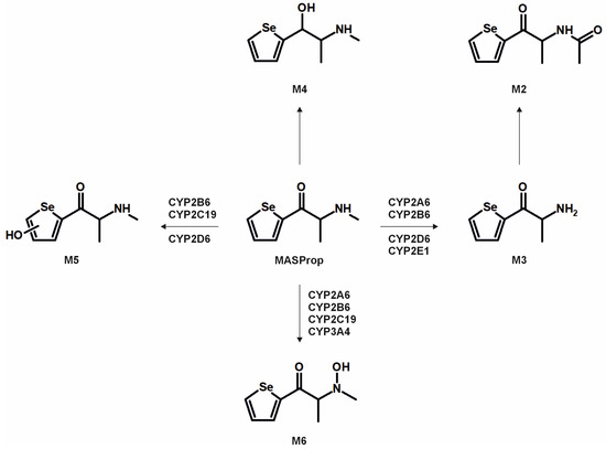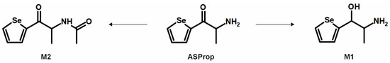 The metabolic pathways of ASProp, MASProp, MASPent, PySProp, and PySPent can be found in Figure 3, Figure 4, Figure 5, Figure 6 and Figure 7. The results of the current study confirmed the hypothesis that similarities exist in their metabolic transformation when compared to compounds containing thiophene or phenyl rings, and the depicted metabolic reactions were already described as metabolic pathways of other phenethylamine or cathinone derivatives [4,15,16,19,20,21].