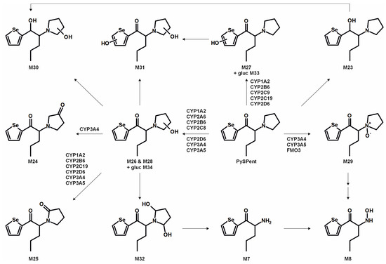 Metabolic pathways of PySPent detected in in vitro incubations or rat urine (gluc: glucuronic acid). Metabolite IDs correspond to Table S2 in the Supporting Information. Metabolic reactions are indicated by arrows. Human monooxygenases identified to be involved in the formation of the given single-step phase I metabolites during the monooxygenase activity screening are indicated.
