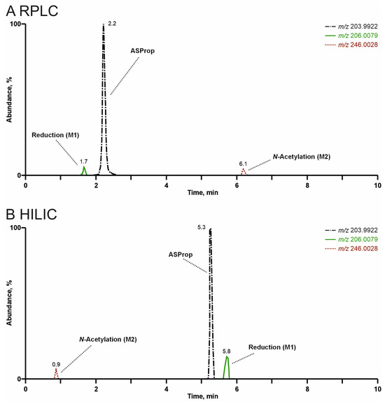 Extracted ion chromatograms of ASProp and its metabolites (M1 and M2) after high-resolution tandem mass spectrometry analysis of rat urine precipitates by reversed-phase liquid chromatography (RPLC, see (A)) or zwitterionic hydrophilic interaction liquid chromatography (HILIC, see (B)).