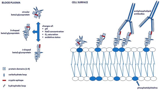 The interaction between β2-microglobulin, phospholipids of plasma membranes, and antiphospholipid antibodies leads to the activation of target cells, including platelets, monocytes, macrophages, neutrophils, and endothelial cells. β2-microglobulin undergoes conformational changes in the blood plasma under the influence of extrinsic and intrinsic factors. In circular and S-shaped forms, it attaches to membrane phospholipids but has no ability to bind to antibodies. Only the J-shaped form has this ability, because this form has a cryptic epitope available for interaction with antibodies [,].