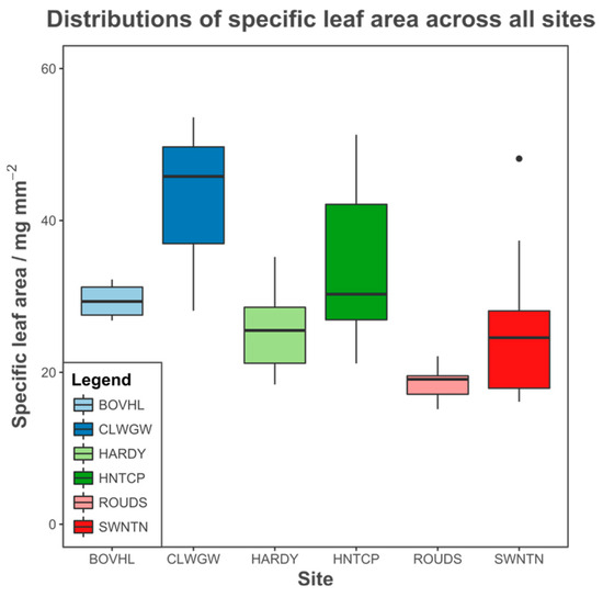 - Hulshof, C.M.; Violle, C.; Spasojevic, M.J.; Mcgill, B.; Damschen, E.; Harrison, S.; Enquist, B.J. Intra-specific and inter-specific variation in specific leaf area reveal the importance of abiotic and biotic drivers of species diversity across elevation and latitude. J. Veg. Sci. 2013, 24, 921–931. [Google Scholar] [CrossRef]