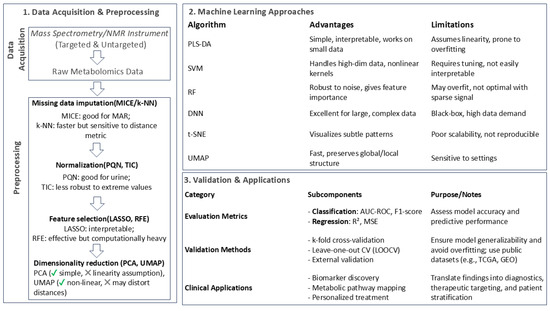 A Computational framework for cancer metabolomics: from data acquisition to clinical applications via machine learning. √ indicates pros, and × indicates cons.