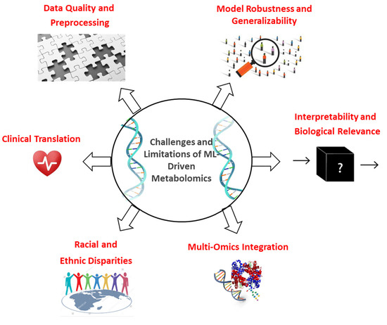 Beyond breast cancer, this review highlights the broader applications of ML in metabolomics for other types of cancers. In colorectal cancer, ML has enhanced early diagnosis and classification through the analysis of salivary and serum metabolomic data [11,12]. In ovarian cancer, ML-driven metabolomics has enabled the identification of diagnostic biomarkers in plasma extracellular vesicles, offering new avenues for non-invasive screening [10]. Similarly, in prostate, thyroid, and pancreatic cancers, machine learning (ML) has been employed to develop diagnostic models and classify disease subtypes, underscoring its versatility and broad applicability across a range of cancer types [13,14,15]. By accumulating the latest findings, this review aims to provide a comprehensive overview of how machine learning is transforming cancer metabolomics research, from subtyping and biomarker discovery to prognostic modeling. We also discuss the challenges and opportunities in this rapidly evolving field, emphasizing the need for robust validation, integration of multi-omics data, and translation of findings into clinical practice. Through this exploration, we hope to underscore the transformative potential of ML-driven metabolomics in advancing cancer research and improving patient outcomes.