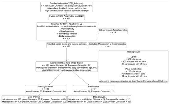 The baseline TOFI_Asia study was conducted at the University of Auckland’s Human Nutrition Unit under the auspices of the High-Value Nutrition National Science Challenge. Participants self-reported as being of either Asian Chinese or European Caucasian ethnicity. The recruitment age for both sexes ranged from 20 to 70 years, BMI (20–45 kg/m2), and glycaemic state (normoglycaemia or prediabetes identified on the basis of fasting plasma glucose (prediabetes FPG: 5.6–6.9 mmol/L), according to American Diabetes Association guidelines []). Exclusion criteria included weight gain or loss greater than 10% within the last three months, bariatric surgery, pregnancy, breastfeeding, use of glucose-related medications, or a current history of metabolic disease, including T2D. A more detailed description of the TOFI_Asia study protocol and cohort has been published elsewhere []. In total, 357 participants were recruited for the baseline TOFI_Asia study: 199 of Asian Chinese descent and 158 of European Caucasian descent [,].