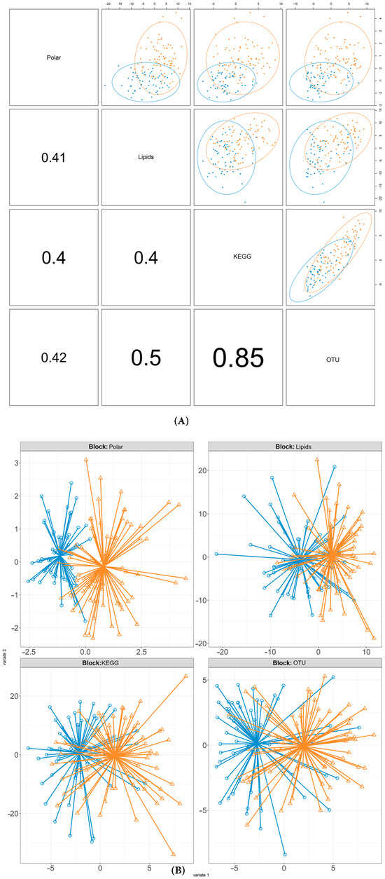 This multi-omics study used four datasets representing different omics data blocks: (1) polar metabolite data, (2) lipid data, (3) relative abundance gene families generated by HUMAnN and regrouped into KEGG pathways (KEGG), and (4) relative abundance profiles for bacterial taxonomy at the species level (OTU). The polar and lipid metabolite data were derived from blood plasma, while the metagenome-derived OTU and KEGG datasets were generated from faecal samples.