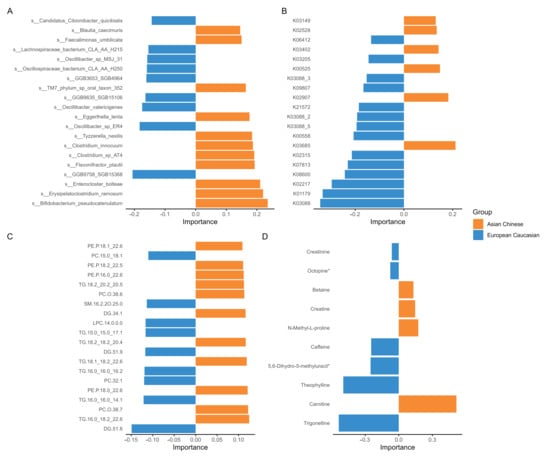 Multivariate analysis of ethnicity using DIABLO. Loading plots represent the top discriminating features for each dataset: (A) bacterial species (OTU), (B) KEGG pathways, (C) lipids, and (D) polar metabolites. Features are sorted according to discriminatory strength; bar colour signifies that a feature’s maximal median value is associated with either Asian Chinese (orange) or European Caucasian (blue).