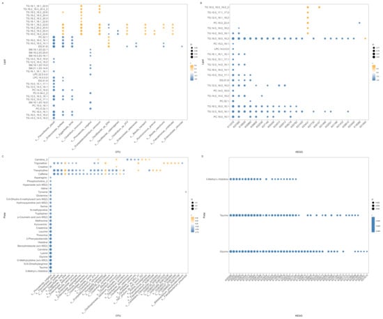 Top cross-omic correlations from the ethnicity DIABLO model. The correlation matrix was derived from the supervised DIABLO model discriminating Asian Chinese vs. European Caucasian participants along components 1–4 and consists of four block pairs: Lipid–OTU (A), Lipid–KEGG (B), Polar–OUT (C), and Polar–KEGG (D). The top 100 feature pairs with the largest correlation are displayed as dots, sized by correlation value magnitude and coloured from blue to orange for negative-to-positive values. Full feature details and correlation values are in Supplementary Tables S6–S9.