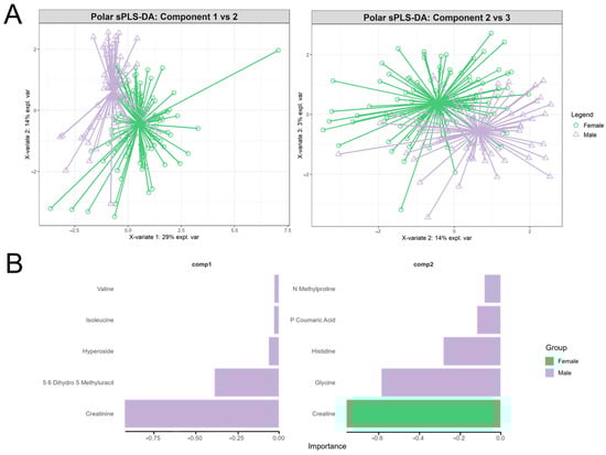 As for features contributing to this separation along component 1, all features were associated with the male group. Key polar metabolites included creatinine, dihydro-5-methyluracil, hyperoside, isoleucine, and valine. Component 2 captured secondary variance, with features in this component associated with female and male groups (Figure 5). The sole feature contributing to the female group and component 2 was creatine, with glycine, histidine, coumaric acid, and N-methyl proline as top contributors to the male group within component 2. The loading plot includes all variables selected by the sPLS-DA model, representing 10 out of the 47 original features.
