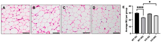 Adipocyte morphology and mean linear intercept (MLI) in perirenal adipose tissue in wild-type (WT) and RAGE KO (KO) mice on standard chow diet (SD) and Western diet (WD). WT-SD (A), WT-WD (B), KO-SD (C), KO-WD (D), all quantified via MLI (E). Scale bars represent 50 µm (Two-way ANOVA with Bonferroni post hoc testing; n = 5; **** p < 0.0001, * p < 0.05).