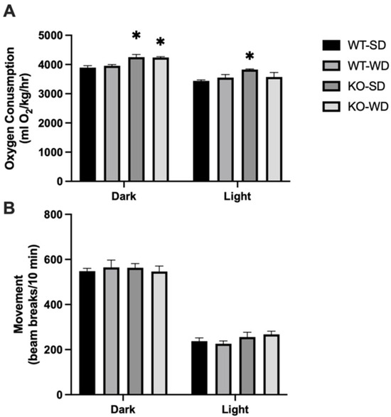 The apparent incongruency between the similar food consumption yet varied adiposity suggested a difference in metabolic rate, which we tested via indirect calorimetry. Our results demonstrated that RAGE KO mice had significantly higher oxygen consumption compared to WT mice (Figure 3A) in the dark phase, with light-phase differences only in the KO-SD group. Interestingly, this appeared to occur independently from physical activity, as movement did not differ between groups (Figure 3B).