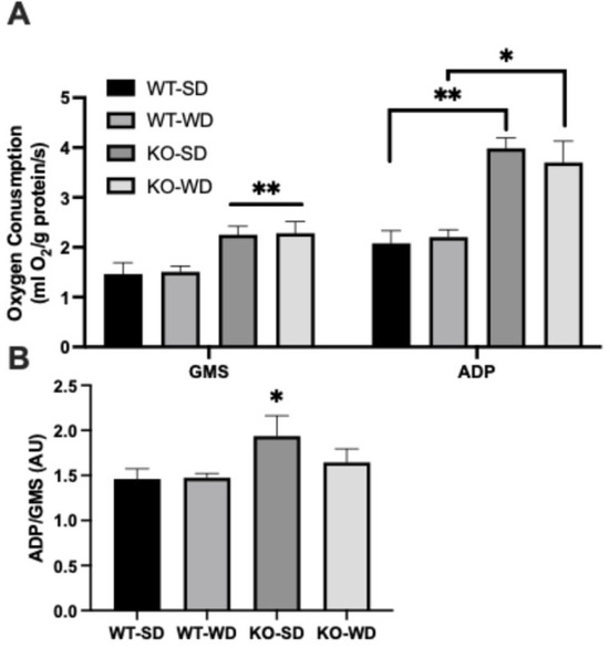 Mitochondrial respiration analysis revealed that perirenal adipose tissue from RAGE KO mice exhibited significantly higher oxygen consumption rates under both complex I + II (glutamate + malate + succinate; GMS) substrates alone and with ADP (Figure 4A) in both dietary conditions. Interestingly, when we compared this with the effect of oxidative phosphorylation-mediated respiration as a function of GMS-supported respiration, only the KO-SD group was significantly different (Figure 4B). Although the ADP/GMS ratio does not represent a classical respiratory control ratio (RCR), it serves here as an index of ADP-stimulated respiration relative to substrate-supported respiration in intact tissue, consistent with prior usage in the bioenergetic profiling of complex tissues.