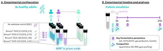 The impact of four doses of the GOS preparation was assessed on the human adult gut microbiota using the ex vivo SIFR® technology (n = 8). (A) Experimental configuration; (B) timeline and analysis.