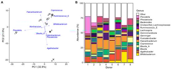 These interpersonal differences could be attributed to markers of the three enterotypes, previously introduced to describe variation in the human gut microbiota [44]. Most variation in the principal component analysis at the genus level (Figure 2A) was explained along PC1 (32.8%) and was differentiated between subjects with high Prevotella (left: subject 2 and especially the 1~Prevotella enterotype) and high Ruminococcus and/or Coprococcus levels (right: subjects 4/6/7). Further, PC2 explained 21.5% of the variation, mostly relating to elevated levels of Faecalibacterium in all subjects except donor 8, who had, in contrast, particularly elevated levels of Agathobacter. These last four genera belong to the Bacillota phylum (~Bacillota (formerly Firmicutes) enterotype). Subject 8 had particularly high levels of Phocaeicola and Bacteroides (~Bacteroides enterotype) (Figure 2B). Finally, Bifidobacterium levels were highest for subjects 5, 6, 8, and especially 7, further illustrating how the microbiomes employed in the present study captured interpersonal differences. This is essential to ensure that the findings of the study are representative at a human population level.