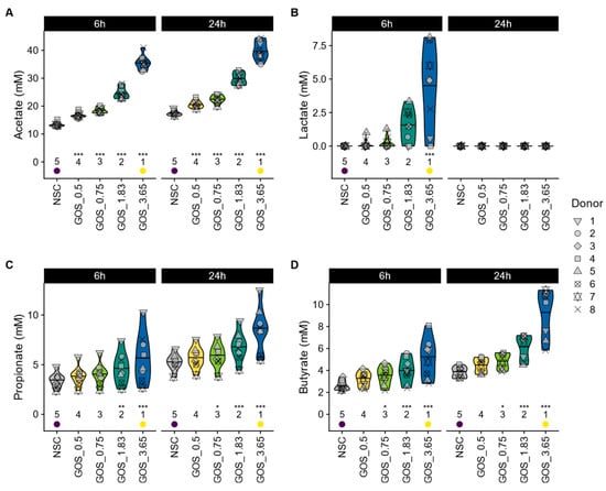 All analyses were performed using R (version 4.4.0; www.r-project.org; accessed on 25 April 2025). First, a series of violin plots, bar charts, and heat maps were constructed (ggplot2 package 3.5.1). While violin plots and bar charts present the actual values, heat maps show log2-transformed fold changes for treatments compared to the reference (NSC). Hence, values of >0 reflect a stimulation on GOS treatment, while values of <0 indicate an inhibition by GOS treatment. Statistical analysis used a linear mixed-effects model, with treatment as a fixed effect and donor identity included as a random effects (lmerTest package v3.1-3). Adjustments for multiple comparisons were performed using the Benjamini–Hochberg correction (stats package 3.6.2). Treatment effects of specific GOS doses compared to the reference (NSC) were assessed via a post hoc pairwise comparison, again with Benjamini–Hochberg correction of p-values. Effects were considered to be significant at padjusted < 0.05. In the violin plots (key fermentative parameters) and stacked bar charts (community composition), statistical differences between specific doses of GOS powder and the NSC are indicated with * (0.01 < padjusted < 0.05), ** (0.001 < padjusted < 0.01), or *** (padjusted < 0.001). In the violin plots, the ranks of average values per study arm are indicated below the statistical indicator, with the lowest and highest values being highlighted in purple and yellow, respectively. Finally, pairwise correlation analysis using Spearman’s rank correlation coefficient was performed between SCFA production and absolute levels of different families.