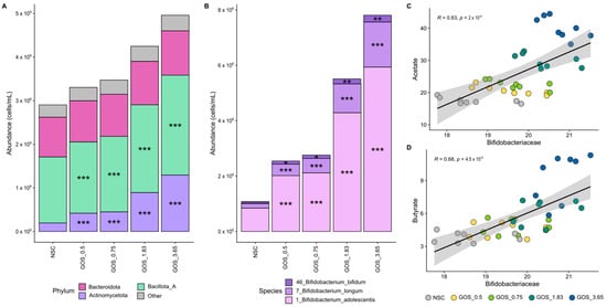 First, GOS strongly and dose-dependently enriched Bifidobacteriaceae, particularly B. adolescentis, correlating with increased acetate and butyrate production. The Bifidobacteriaceae family was the most abundant family within the Actinomycetota phylum, covering, on average, 90.5% of its abundance at 24 h. GOS stimulated Bifidobacteriaceae significantly from the lowest dose onwards, which related to dose-dependent and statistically significant increases of OTUs related to all three detected Bifidobacterium species, i.e., B. bifidum, B. longum, and particularly B. adolescentis. Strong and statistically significant correlations between Bifidobacteriaceae and both acetate (Figure 5C) and butyrate (Figure 5D) suggest the involvement of Bifidobacteriaceae in the production of these SCFAs upon GOS treatment.