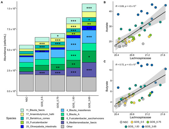 GOS significantly stimulated Lachnospiraceae members from the lowest test dose onwards, relating to enhanced acetate and butyrate production. Average level (cells/mL) of (A) Lachnospiraceae (main family within Bacillota_A; deconvoluted in its main OTUs) (n = 8), along with correlations of absolute Lachnospiraceae levels with (B) acetate and (C) butyrate.