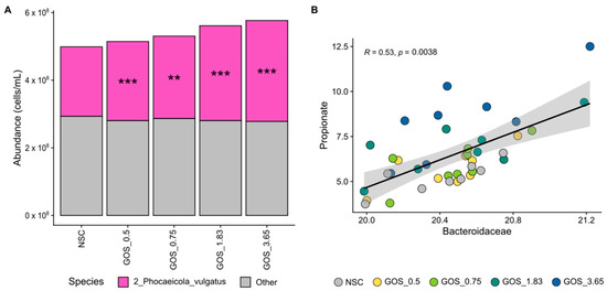 Finally, GOS selectively enriched Bacteroidaceae, particularly Phocaeicola vulgatus, which correlated with increased propionate production. Bacteroidaceae was the most abundant Bacteroidota family, covering, on average, 83.4% of its abundance at 24 h. GOS significantly stimulated an OTU related to Phocaeicola vulgatus, an abundant member of this family, from the lowest test dose onwards (Figure 7A). The abundance of this OTU correlated with propionate levels (Figure 7B), suggesting the involvement of P. vulgatus in propionate production upon GOS treatment.