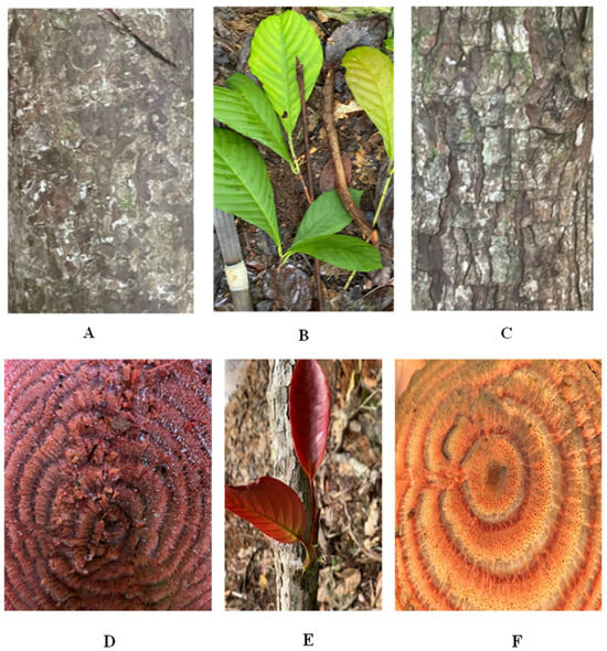 Morphological features of D. dentatus’ red and white ecotypes morphological features. (A). D. dentatus red outer bark, (B) mature leaves of both ecotypes, (C) D. dentatus’ white outer bark, (D) D. dentatus red inner bark, (E) D. dentatus’ young leaves of both ecotypes and (F) D. dentatus’ white inner bark. Photos taken by Ewart Smith (21N0261909-0578704—Potaro Siparuni Region, 8 August 2021, Guyana).