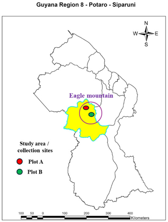 Map of the Study area on the Eagle Mountain Forest located in Potaro Siparuni (21N0261909-0578704) Region 8. The yellow area highlights Potaro Siparuni Region 8 of which the study area is a part of. Plot A the collection of the D. dentatus red ecotype represented by a red circle. Plot B collection of D. dentatus white ecotype represented by the green circle.