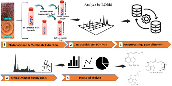 The workflow diagram outlines a detailed analysis process for phytohormones and untargeted metabolites in D. dentatus plant material. The orange arrows present the different steps in the analysis. (1) the extraction using a MeOH/CHCl3/H2O solvent mixture, resulting in separated fractions. (2–3) LC-MS analysis flow, with data processing focused on peak alignment and quality control through chromatographic profiles. (4) the statistical analysis and visualization using bar charts, line graphs, and pie charts. (5) the final output identifies specific phytohormones and secondary metabolites compounds. The icons used are a combination of Noun Project and BioRender.com.