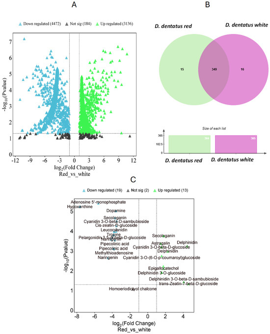 Comparative analysis of phytochemical profiles between D. dentatus red and white ecotypes. (A) Volcano plot displaying differential putative metabolites between red and white ecotypes, where green indicates upregulated metabolites in red, blue indicates downregulated metabolites, and black represents non-significant changes. The x-axis corresponds to the logarithmic fold change, which indicates the extent and direction of tentative metabolite expression changes. The y-axis provides the −logarithmic p-values, which indicate the statistical significance of these changes. (B) Venn diagram highlighting shared and unique metabolites in red and white ecotypes, accompanied by bar plots showing the total number of metabolites identified in each ecotype. (C) Highlighted metabolites with significant fold changes, showing key bioactive compounds such as secondary metabolites and phytohormones with differential abundance between the two ecotypes.