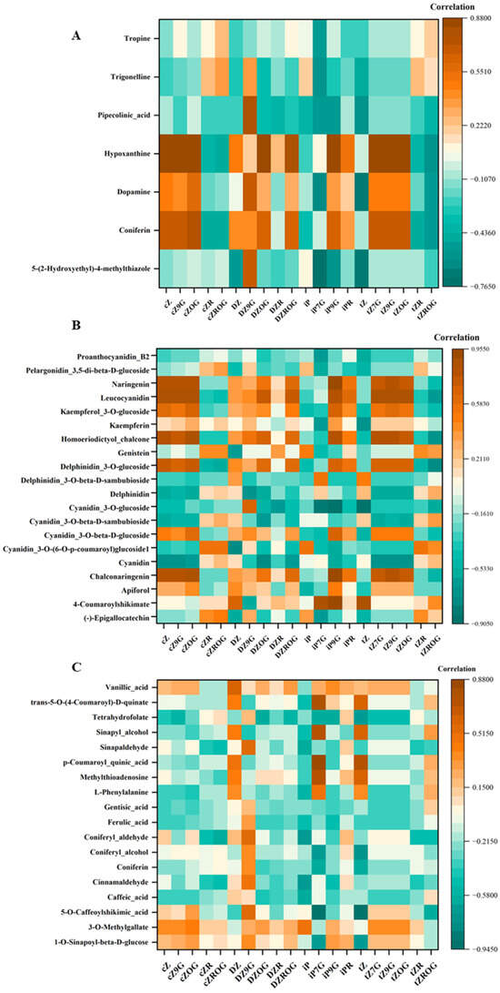 The correlation matrix revealed relationships between different Zeatin forms and other compounds, where orange indicated positive correlations and teal indicated negative correlations (Figure 7). cZ type CKs (i.e., cZ, cZ9G, cZOG, cZR, and cZROG) showed positive correlations with coniferin and dopamine, while cZ, cZ9G, cZR, and cZROG exhibited negative correlations with pipecolinic acid (Figure 7). DZ type CKs (i.e., DZ, DZR, DZ9G, DZOG, and DZROG) were positively correlated with hypoxanthine and coniferin and negatively correlated with pipecolinic acid. iP type CKs (i.e., iP, iP7G, iP9G, iPR) were positively correlated with hypoxanthine and dopamine. Finally, tZ type CKs (i.e., tZ, tZ7G, tZ9G, tZOG, tZR, and tZROG) had positive correlations with tropine and negative correlations with coniferin. Proanthocyanidin B2, pelargonidin 3,5-di-beta-D-glucoside, naringenin, and leucocyanidin showed strong positive correlations among themselves, but negative correlations with tZ type CKs (i.e., tZ, tZ7G, tZ9G, tZOG, tZR, and tZROG). Kaempferol 3-O-glucoside, kaempferin, and homoeriodictyol chalcone were positively correlated, but were negatively correlated with cZ type CKs (i.e., cZ, cZ9G, cZOG, cZR, and cZROG). tZ was positively correlated with delphinidin 3-O-glucoside, which in turn showed positive correlations with delphinidin 3-O-beta-D-sambubioside and delphinidin. Further positive correlations were observed within the cyanidin series (cyanidin 3-O-glucoside, cyanidin 3-O-beta-D-sambubioside, cyanidin 3-O-beta-D-glucoside, and cyanidin 3-O-(6-O-p-coumaroyl) glucoside), as well as between cyanidin, chalconaringenin, apiforol, 4-coumaroylshikimate, and (-)-epigallocatechin. Notably, (-)-epigallocatechin exhibited positive correlation with cZ type CKs (i.e., cZ, cZ9G, cZOG, cZR, and cZROG), while DZ type CKs (DZ, DZ9G, DZOG, DZR, DZROG) showed some correlations with other compounds, and tZ derivatives were negatively correlated with proanthocyanidin B2, pelargonidin 3,5-di-beta-D-glucoside, naringenin, and leucocyanidin (Figure 7).