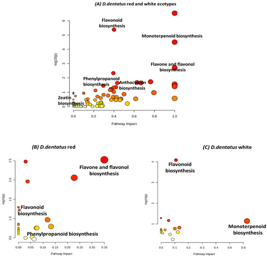 Pathway enrichment analysis with pathway impact values combines p-values in a topology analysis using KEGG pathways in MetaboAnalyst 6.0 in the form of a scatter plot. Scatter plot data revealed the impacts and significance of various biosynthesis pathways in D. dentatus ecotypes (Figure 8). In the red ecotype, key pathways such as flavonoid biosynthesis, monoterpenoid biosynthesis, flavone and flavonol biosynthesis showed high impact and significance, as evidenced by large, dark red dots. These pathways are closely associated with secondary metabolites involved in pigmentation and aroma, reflecting the red ecotype’s distinct colouration. Additionally, anthocyanin biosynthesis, another pathway related to pigmentation, displays significance (p = 0.02 < 0.05), further highlighting the metabolic emphasis on colouration in the red ecotype.
