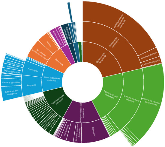 Based on the categorization of compounds via ClassyFire [121] as represented by the sunburst plot (Figure 9), 794 compounds at MSI annotation levels 1 to 3 in Doliocarpus dentatus were mostly grouped under phenylpropanoids and polyketides (14.9%), organic acids and derivatives (21.5%), organic oxygen compounds (21.3%), lipids and lipid-like molecules (10.7%) and organoheterocyclic compounds (13.3%) (Figure 9). This constitutes both ecotypes with compounds extracted from both chloroform and methanol fractions. For the compound class of lipids and lipid-like compounds, terpenoids, which falls under prenol lipids, accounted for 35.7% (Figure 9). Flavonoids, which falls under phenylpropanoid and polyketides compound class (also including isoflavonoids and other flavonoid types), constituted 61.5% (Figure 9). Alkaloids and derivatives accounted for 2% of annotated compounds. Surprisingly, carboxylic acids and derivatives constituted most organic acids and derivatives (85.7%), of which amino acids, peptides and analogues dominated (90.3%) (Figure 9). This shows that despite differences in extraction methods previously published compared to these results, there is still representation for flavonoid and terpenoid biosynthesis.