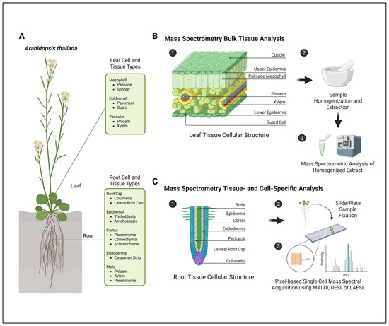 Comparison of mass spectrometry analyses performed using bulk tissue sample preparation versus spatial metabolomics workflows. (A) Individual tissue and cell types found within leaves and roots of Arabidopsis thaliana. (B) Schematic diagram of the leaf cellular structure and generalized sample preparation of leaf tissue samples for mass spectrometry bulk-tissue-type analyses. (C) Schematic diagram of the root cellular organization and generalized sample preparation for tissue-specific and single-cell-type spatial metabolomics analyses. Figure created in BioRender. Myers, R. (2025) https://BioRender.com/5lqoxwf.