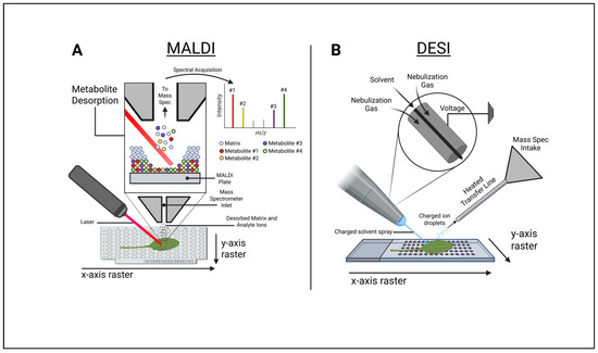 Illustrative comparison between matrix-assisted laser desorption ionization (MALDI) and desorption electrospray ionization (DESI) mass spectral imaging technologies. (A) Schematic diagram of typical MALDI mass spectral imaging ion generation and spectral acquisition of spatial data. (B) Schematic diagram of typical DESI mass spectral imaging ion generation and mass spectral intake. Figure created in BioRender. Myers, R. (2025) https://BioRender.com/y4pnozn.