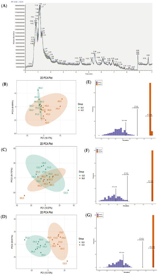 Overlay of TIC for mass spectrometry detection of QC samples (A). Differences in metabolite distribution across protein groups, plots of PCA scores of mass spectrometry data of LD samples and quality control samples (B–D), OPLS-DA validation plots of the longest dorsal muscles of Tibetan pigs in each group (E–G).