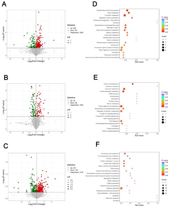 Volcano plot of LD differential metabolites (A–C), KEGG differential metabolite pathway enrichment map (D–F).