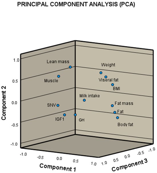 Figure 1 shows a principal component analysis of the grouping of the variables that were associated with each other and that had similarity in their effects. It can be seen that the variables of lean mass, muscle, snv, igf.1, gh and milk intake were grouped, while the variables of weight, visceral fat, BMI, fat mass, fat and body fat generated another group.