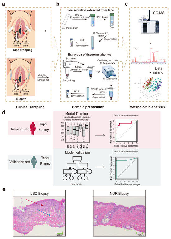 Flowchart of experiment design. (a) Skin biopsy and tape stripping sampling. (b) Skin metabolite extraction. (c) GC–MS-based metabolomics approach and metabolite data mining. (d) Schematic overview of machine model construction using training (red) and validation (blue) sets of data. (e) Histological sections of the vulvar lichen simplex chronicus skin (LSC Biopsy) and normal vulvar skin (NOR Biopsy) with H&E. Red arrows indicate epidermal thickening in the granular layer and stratum spinosum; blue arrows denote chronic inflammatory infiltration in the superficial dermis. Abbreviations: MCF, methyl chloroformate; GC–MS, gas chromatography–mass spectrometry; ANN, artificial neural network; DT, decision tree; KNN, K nearest neighbor; LR, logistics regression; NB, Naïve Bayes; RF, random forest; SVM, support vector machine; LSC, lichen simplex chronicus; and NOR, normal.