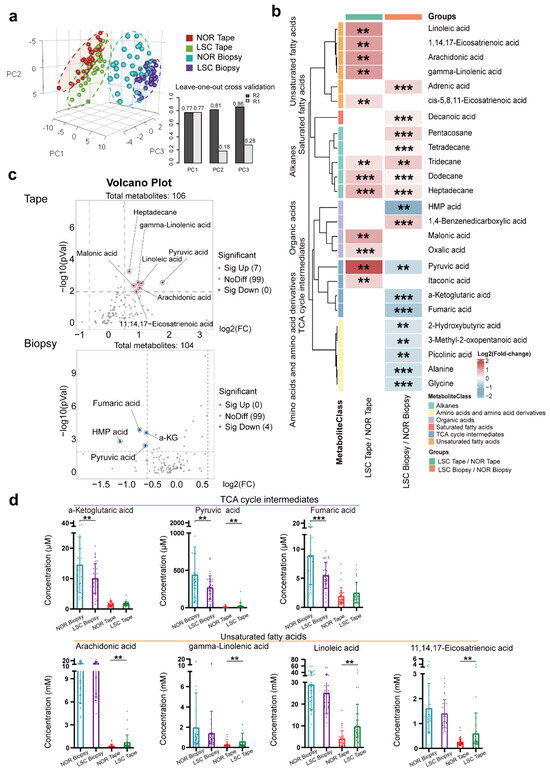 Metabolite profiles of tape stripping and biopsy samples in the LSC and normal skin groups (n = 36). (a) Partial Least Squares Discriminant Analysis (PLSDA): LSC tape stripping (green), normal tape stripping (red), LSC biopsy (purple), and normal biopsy (blue). Leave-One-Out Cross Validation (LOOCV) analysis of the PLSDA model with good predictive performance for PC1 (R2: 0.77, Q2: 0.77), PC2 (R2: 0.81, Q2: 0.18), and PC3 (R2: 0.86, Q2: 0.28). (b) Heatmap showing relative metabolite concentrations for the two types of samples and their metabolic classification. The relative concentrations of sample metabolites are illustrated using log2 scale. Red color blocks represent higher metabolite levels in numerator (LSC samples) than in the denominator (normal samples), whereas blue color blocks represent lower metabolite levels in LSC samples than in the normal samples. Only the metabolites with a p-value (Student t-test) less than 0.01 and a q-value (false discovery rate, FDR) less than 0.05 are displayed. (c) Volcano plot of the metabolites with differential concentrations (p < 0.05, FC > 1.5) between LSC and normal samples in the biopsy and tape stripping groups. Red dots indicate increased concentrations, while blue dots indicate decreased concentrations in LSC samples compared to the normal samples. (d) Box plots of actual metabolite concentrations for TCA cycle intermediates and unsaturated fatty acids. (** p-values < 0.01, *** p-values < 0.001). Abbreviations: LSC, lichen simplex chronicus; NOR, normal; HMP acid, 3-(4-hydroxy-3-methoxyphenyl)-,2-propenoic acid; and a-KG, a-Ketoglutaric acid.