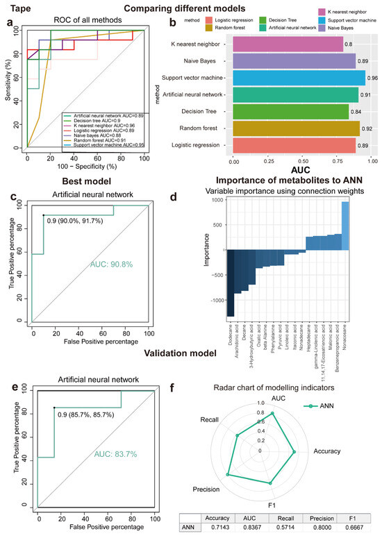 Seven machine learning models to identify discriminating metabolites for tape samples. (a,b) ROC curve analysis and corresponding AUC (median with 95% confidence interval) of every model for tape samples. (c) The AUC of ANN is 90.8%. (d) Importance of metabolites to ANN model. (e) ANN is the best model validation (AUC = 83.7%) using an independent patient cohort. (f) Radar chart illustrating the performance of the ANN model across key metrics, including accuracy, AUC, recall, precision, and F1 score. A larger area enclosed by the chart signifies better overall performance across multiple evaluation criteria. Abbreviations: ROC, receiver operating characteristic; AUC, the area under the ROC curve; ANN, artificial neural network; DT, decision tree; KNN, K nearest neighbor; LR, logistics regression; NB, Naïve Bayes; RF, random forest; and SVM, support vector machine.