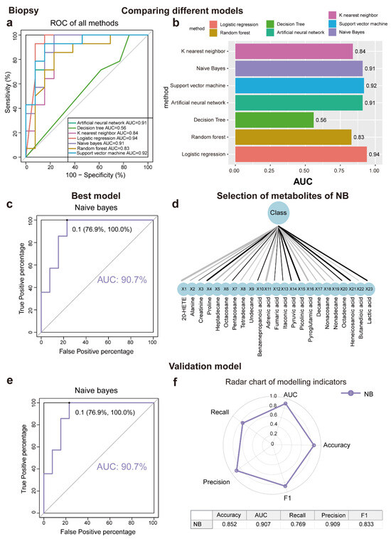 Seven machine learning models to identify discriminating metabolites for biopsy samples. (a,b) ROC curve analysis and corresponding AUC (median with 95% confidence interval) of every model for biopsy samples. (c) NB is the best machine learning model with AUC = 88.9%. (d) Selection of metabolites for NB model using recursive feature elimination (RFE). (e) NB model validation (AUC = 90.7%) using an independent patient cohort. (f) Radar chart illustrating the performance of the NBD model across key metrics, including accuracy, AUC, recall, precision, and F1 score. A larger area enclosed by the chart signifies better overall performance across multiple evaluation criteria. Abbreviations: ROC, receiver operating characteristic; AUC, the area under the ROC curve; ANN, artificial neural network; DT, decision tree; KNN, K nearest neighbor; LR, logistics regression; NB, Naïve Bayes; RF, random forest; and SVM, support vector machine.