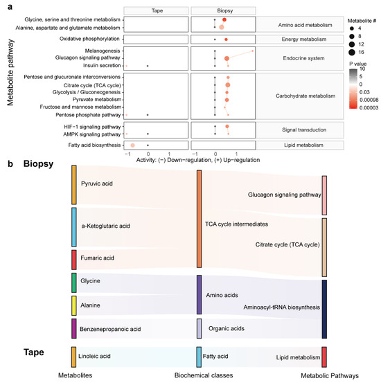 To further explore the biological role of differentially abundant metabolites, we performed a pathway enrichment analysis based on the KEGG metabolic network (Figure 5a). The predicted pathway analysis showed that a predominant portion of the differences in the metabolism of the tissues encompass energy metabolism, the endocrine system, carbohydrate metabolism, signal transduction, and amino acid metabolism, which were upregulated in the LSC biopsy. In contrast, four metabolic pathways associated with the metabolism of the endocrine system, signal transduction, and lipid biosynthesis were downregulated in the LSC tape samples. Next, we took the metabolites identified by the machine-learning models and linked them to the altered metabolic pathways using a Sankey diagram (Figure 5b). The majority of metabolites from the biopsy samples participated in the TCA cycle, whilst a reduction in linoleic acid was linked to the decreased lipid metabolism observed in the tape samples.