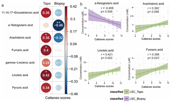 Standardized linear regression analyses displaying the relationship between differentially abundant metabolites and the LSC Cattaneo scores for the tape and biopsy groups. (a) Circular correlogram showing relationships between Cattaneo scores and metabolite levels. Numbers and circle sizes represent standardized regression coefficients. Red and blue circles indicate positive and negative linear associations, respectively (* p-values < 0.05, ** p-values < 0.01). (b) Scatter plots with regression lines for metabolites significantly correlated with Cattaneo scores. The shadow around the trendline shows the 95% CI. r is the standardized regression coefficient, and p is the statistical significance.