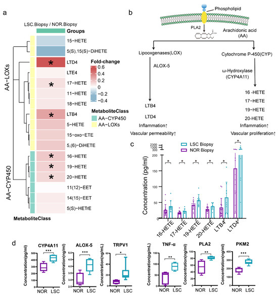 To investigate the downstream products of omega-6 fatty acids derived from linoleic acid and arachidonic acid, we also quantified 20 oxylipins in samples from both LSC and NOR groups (Figure 7a). There were elevated concentrations of the majority of oxylipins in LSC samples, particularly the downstream oxylipins of arachidonic acid-lipoxygenases (AA-LOX) and arachidonic acid-cytochrome P450 (AA-CYP450). Importantly, downstream oxylipins of AA-LOX, namely LTB4 and LTD4, are associated with inflammation and vascular permeability. The AA-CYP450-catalyzed metabolism produced n-HETE analogues (16-HETE, 17-HETE, 18-HETE, 19-HETE, and 20-HETE), which contribute to inflammatory responses and vascular endothelial cell proliferation (Figure 7b,c) [44,45]. However, no statistically significant differences in concentrations were observed for the downstream oxylipin products of linoleic acid. To substantiate the changes in metabolite levels, the expression of pivotal enzymes and proteins involved in lipid oxidation and energy metabolism in tissue samples from five individuals was measured by ELISA. We found an upregulation in the expression of enzymes and inflammatory factors, including PLA2, ALOX5, CYP4A11, PKM2, TNF-α, and TRPV1, within LSC tissues (Figure 7d).
