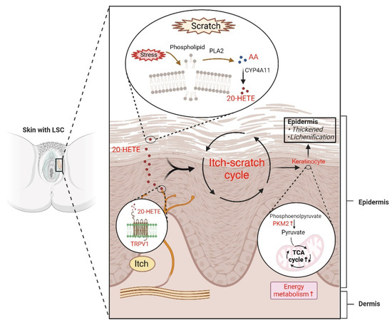 Summary of proposed metabolic mechanisms underlying lichen simplex chronicus (LSC). Vulvar itching is intricately linked to the specific anatomical location of the vulva, rendering it more susceptible to irritants due to its proximity to the urinary, reproductive, and digestive tracts. Additionally, external stress such as chafing and scratching can disrupt skin cell membranes, triggering the activation of PLA2. This enzyme catalyzes the breakdown of phospholipids in the skin into AA, which further undergoes metabolism by CYP4A11 to form 20-HETE. Furthermore, 20-HETE can directly bind to the TRPV1 receptor, inducing itching and initiating the itch–scratch cycle. Subsequent scratching enhances PKM2 activity and increases tricarboxylic acid cycle flux. Ultimately, these cascading events fuel keratinocyte proliferation and culminate in the thickening and lichenification of the vulvar skin. Abbreviations: TCA, tricarboxylic acid. (Created with BioRender.com, accessed on 7 August 2024).