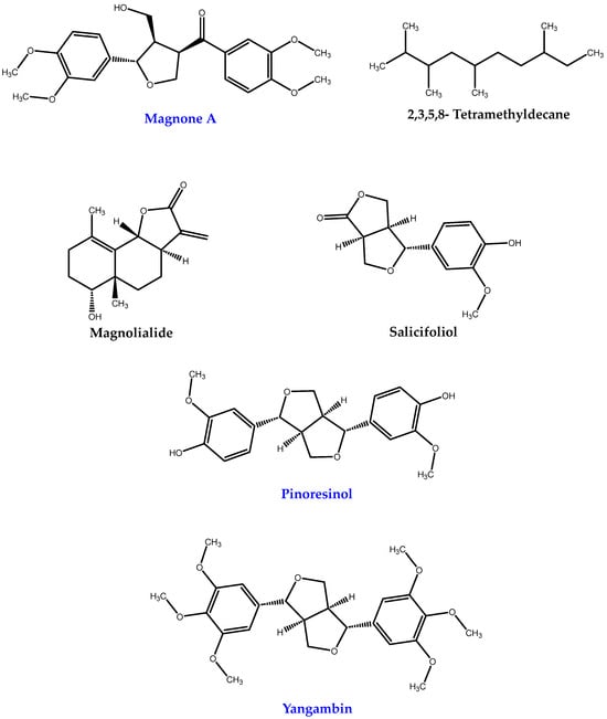 - Song, Q.; Fischer, N.H. Biologically active lignans and neolignans from Magnolia species. J. Mex. Chem. Soc. 1999, 43, 211–218. [Google Scholar]