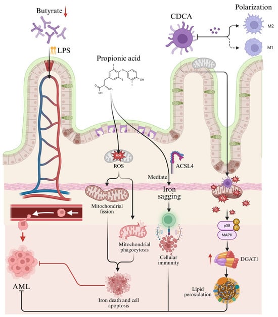 At the metabolite level, gut microbiota-derived short-chain fatty acids (SCFAs) exert direct anti-leukemic effects. Wei et al. [] demonstrated that propionate induces ferroptosis in AML cells through two coordinated mechanisms: (1) Additionally, propionate can induce iron depletion through the mediation of Acyl-CoA Synthetase Long Chain Family Member 4 (ACSL4); and (2) propionate could promote the accumulation of reactive oxygen species (ROS) and disrupt redox balance, leading to mitochondrial fission and mitophagy, thereby enhancing ferroptosis and apoptosis in AML cells. This dual action culminates in lethal lipid peroxidation characteristic of ferroptosis while simultaneously enhancing AML cell immunogenicity [].
