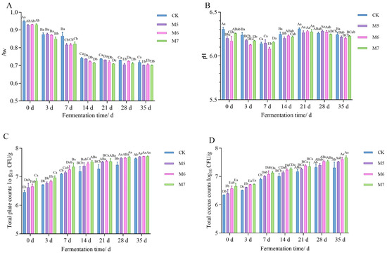As shown in Table 1, the fermentation time, M. caseolyticus concentrations, and their interaction significantly influenced the Aw and pH value of sausages (p < 0.05). The changes of Aw during fermentation are illustrated in Figure 1A. The Aw values of four groups decreased rapidly at the beginning of fermentation (p < 0.05). However, they slowly reduced after 14 days of fermentation. After 35 days of fermentation, the Aw for all the sausages, CK, M5, M6, and M7, decreased to 0.718, 0.702, 0.704, and 0.700, respectively. The results could be possibly attributed to the internal moisture migration and the evaporation of surface moisture during the drying process. At the end of fermentation (35 d), the Aw of the sausages inoculated with M. caseolyticus was significantly lower than that of the control group (p < 0.05). The decline in Aw possibly correlated with the microbial utilization of free water [22], suggesting that the Aw of the sausages was greatly diminished by M. caseolyticus fermentation.