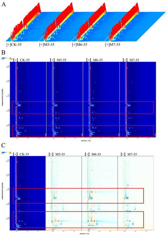 The heatmap analysis (Figure 6A) yielded results consistent with the PCA score plot, which further highlighted the significant differences in the VOCs profiles among different treatment groups. Three parallel samples from the group were clustered together, indicating sufficient reproducibility between the samples. Notably, the CK and M5 group first clustered together, indicating that the M6 and M7 groups had a more different influence on flavor formation. However, the M6 and M7 groups were also not clustered in the same cluster, suggesting the differences in VOCs between them.