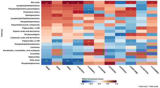 Metabolite set enrichment analysis (MSEA) [] was used to evaluate the associations of GRS and SNPs with metabolite classes (n = 20). We assigned a metabolite class based on chemical taxonomy for 306 of the 427 metabolites. In total, there were 20 metabolite classes with at least 3 metabolites per class: bile acids; lysophosphatidylcholines; phosphatidylcholine plasmalogens; cholesteryl esters; sphingomyelins; lysophosphatidylethanolamines; phosphatidylcholines; organoheterocyclic compounds; triglycerides with <3 double bonds (DB); organic acids and derivatives; PE plasmalogens; carboxylic acids and derivatives; triglycerides with ≥3 DB; phosphatidylethanolamines; carnitines; nucleosides, nucleotides, and analogues; ceramides; diglycerides; fatty acyls; and phosphatidylserines. False discovery rate (FDR) was used to control for multiple comparisons []. An FDR < 0.05 was considered statistically significant, and an FDR < 0.2 was considered as worthy of further investigation. Metabolite analyses were conducted in R v4.2.0 (R Foundation for Statistical Computing).