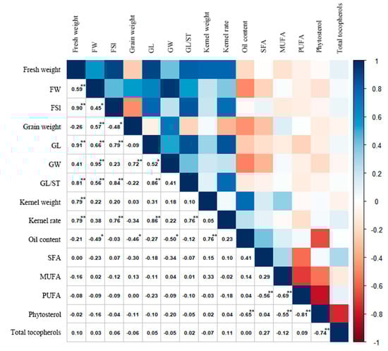 Spearman’s correlation coefficients calculated from pair-wise comparisons between fruit morphology, oil content, phytosterol content, tocopherol content, and saturated, monounsaturated, and polyunsaturated fatty acid content in C. retusus accessions. FW, fruit width; FSI, fruit shape index; GL, grain length; GW, grain width; GL/ST, grain length/shell thickness; SFA, saturated fatty acid; MUFA, monounsaturated fatty acid; PUFA, polyunsaturated fatty acid. * p < 0.05; ** p < 0.01.