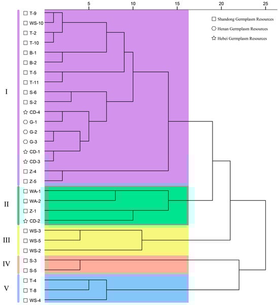 Cluster analysis of standardized data for fruit morphology, fatty acids, phytosterols, and tocopherols across 30 C. retusus accessions (Figure 2) revealed five distinct groups at a distance threshold of 16: Group I comprised eighteen accessions (T-9, WS-10, T-2, T-10, B-1, B-2, T-5, T-11, S-6, S-2, CD-4, G-1, G-2, G-3, CD-1, CD-3, Z-4, Z-5); Group II contained four (WA-1, WA-2, Z-1, CD-2); Group III consisted of three (WS-3, WS-5, WS-2); Group IV included two (S-3, S-5); and Group V encompassed three (T-4, T-8, WS-4). Analysis of provenance information indicated substantial variation, demonstrating that clustering did not strictly correspond to geographical origin.