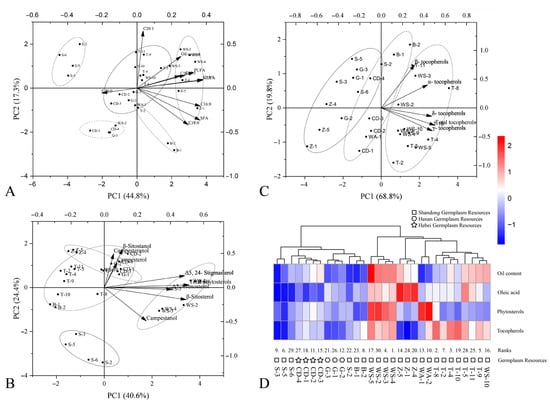 Analysis of numerous fruit morphological indicators was included in the aforementioned assessments to understand fruit quality characteristics across different germplasm accessions. Two-dimensional PCA biplots were constructed based on the composition and content data of fatty acids, phytosterols, and tocopherols in the kernels, as shown in Figure 3A–C, respectively. A clustered heatmap was generated using standardized data for oil content, oleic acid content, total sterols, and total tocopherols (Figure 3D).